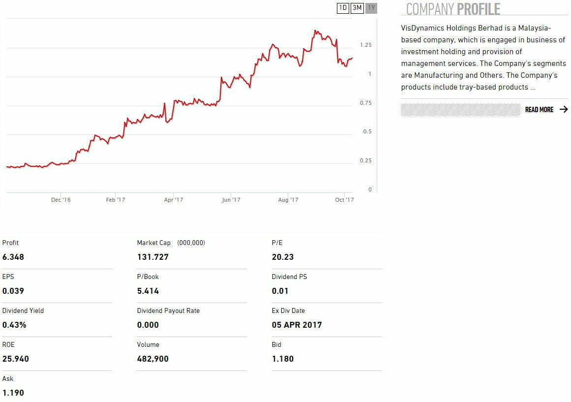 Visdynamics mengeluarkan peralatan untuk pemasangan dan ujian semikonduktor. Kalau nak tahu semikonduktor ni benda wajib digunakan dalam komputer dan smartphone. Jom lihat pergerakan harga saham mereka:
