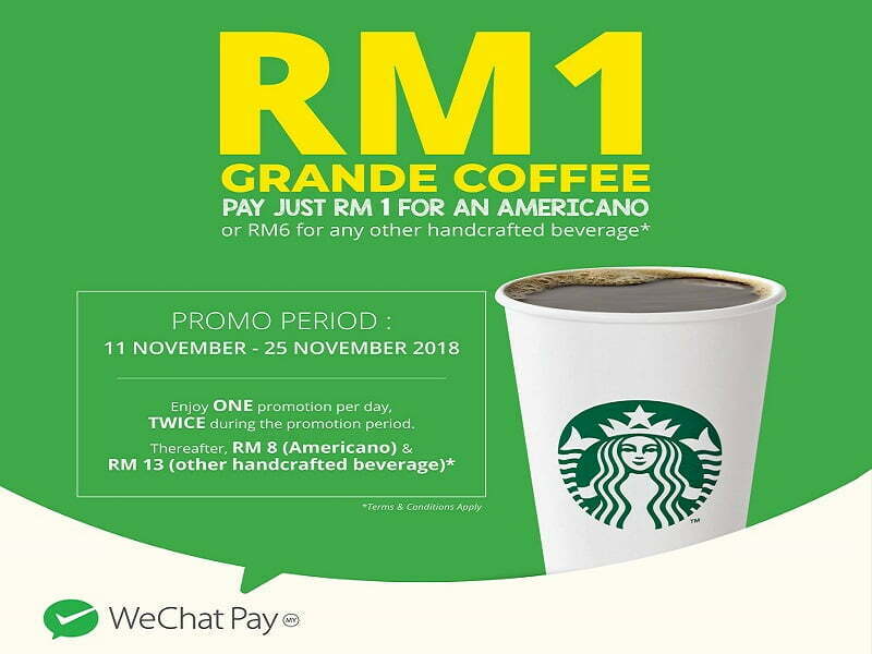 Pengguna WeChat Pay MY dapat menikmati Caffe Americano bersaiz Grande yang lazat, untuk hanya RM1, dan hanya RM6 untuk kopi bersaiz besar lain
