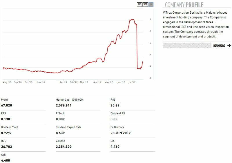 - Harga saham syarikat yang sedang menaik (uptrend) – Vitrox nampak macam menurun sikit, tapi sebenarnya saham tersebut mengalami split, iaitu seunit saham terbahagi kepada dua unit saham.