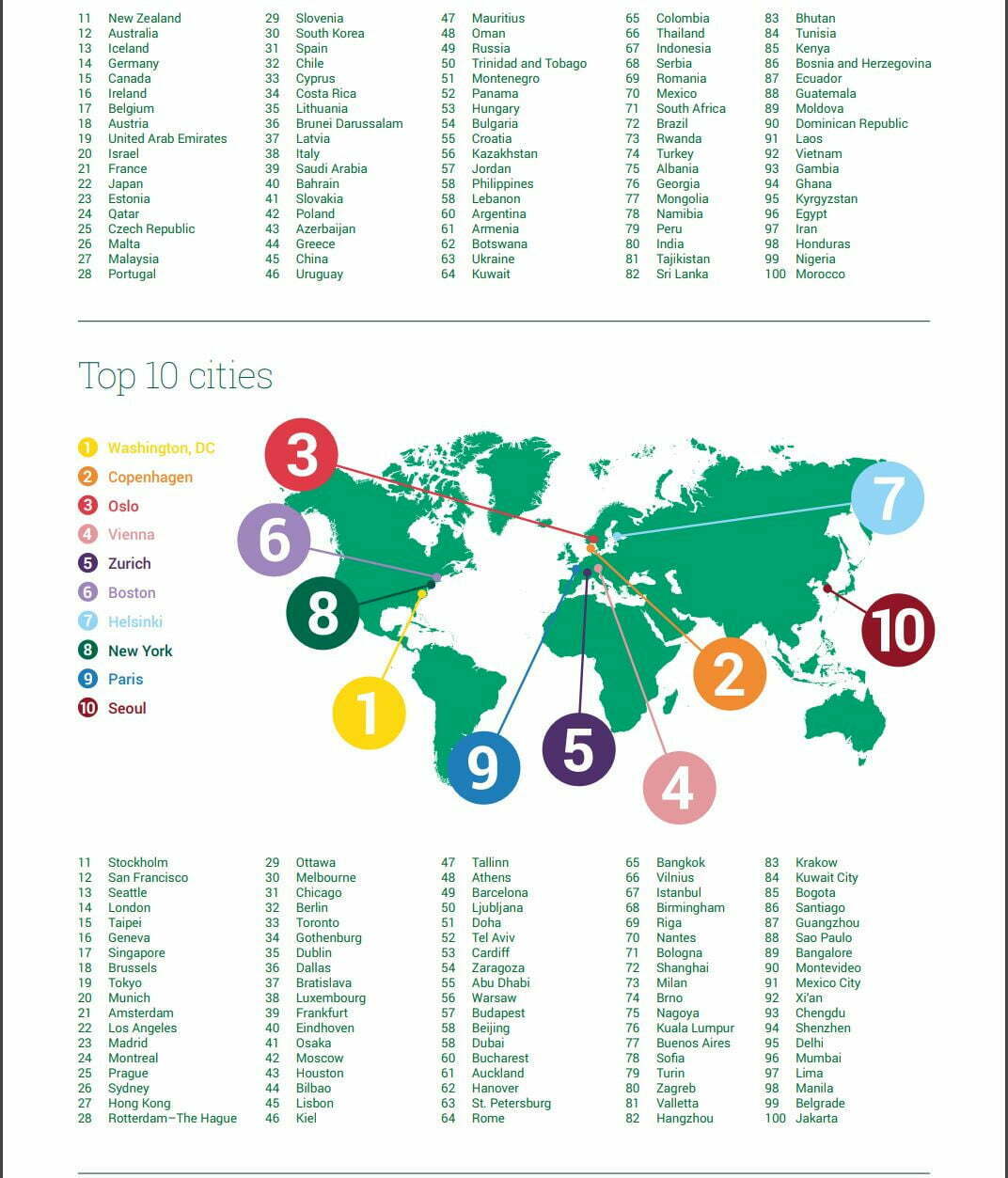 Bandar raya dengan kedudukan tertinggi tahun ini ialah Washington, DC, diikuti oleh Copenhagen, Oslo, Vienna dan Zurich. Kedudukan Washington dapat dikaitkan dengan prestasi yang mantap pada empat daripada lima tonggak yang diukur dalam penyelidikan, khususnya tonggak “Menjadi Global”, “Menarik”, “Berkembang” dan “Mendayakan”. Ekonomi yang stabil, penduduk yang dinamik, infrastruktur dan ketersambungan yang cemerlang, tenaga kerja yang berkemahiran tinggi dan Pendidikan bertaraf dunia merupakan semua ciri yang menyumbang kepada bandar menjadi hab bakat.
