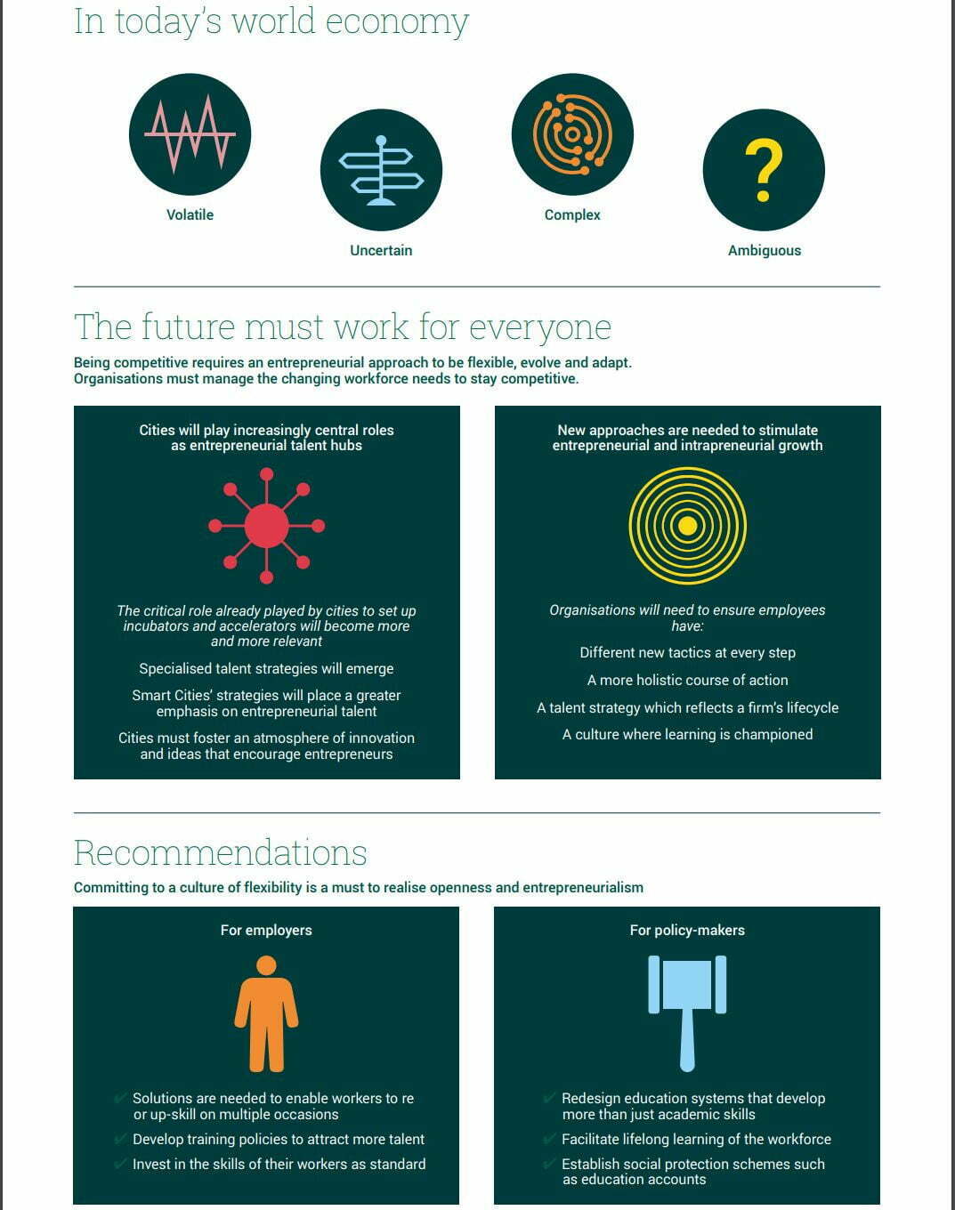 Laporan itu juga mendedahkan bahawa bandar-bandar dan bukannya negara sedang membangunkan peranan yang lebih besar sebagai hab bakat dan akan menjadi penting dalam membentuk semula bakat dunia. Kepentingan yang semakin meningkat bagi bandar-bandar ini adalah disebabkan oleh kefleksibelan dan keupayaan mereka untuk menyesuaikan diri dengan trend dan corak baharu – sebagai unit ekonomi yang lincah di mana dasar dapat diubah dengan pantas. Oleh itu bandar-bandar lebih menarik untuk bakat, terutama bakat keusahawanan.