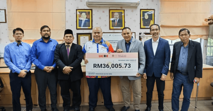 TANJONG MALIM – Universiti Pendidikan Sultan Idris (UPSI) melalui Wakaf, Endowmen, Zakat, Khairat dan Sedekah (WEZAS) menerima sumbangan zakat korporat berjumlah RM36,005.73 daripada UAC Berhad, anak syarikat Lembaga Tabung Angkatan Tentera (LTAT), pada satu majlis ringkas di Bangunan Canselori UPSI, kelmarin.
