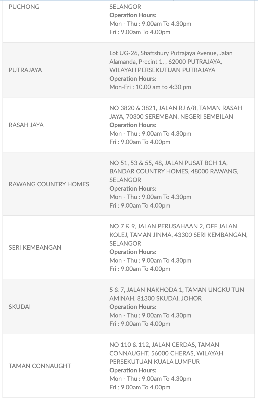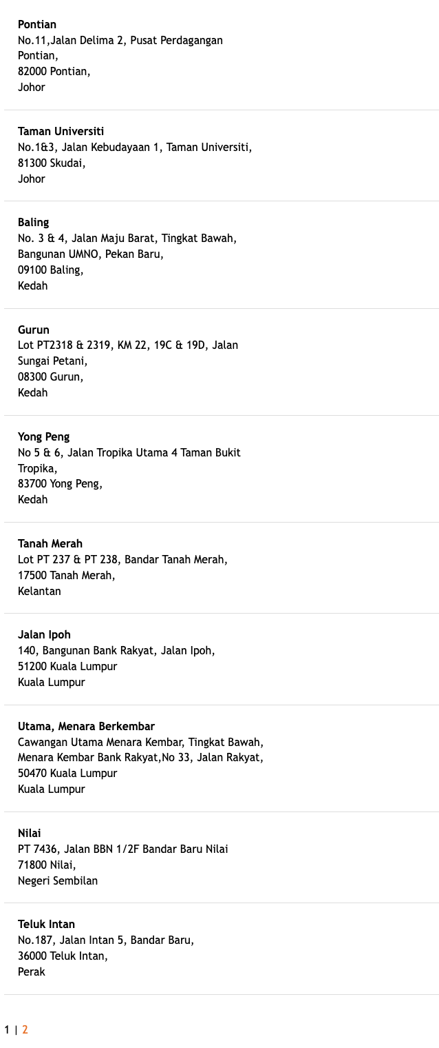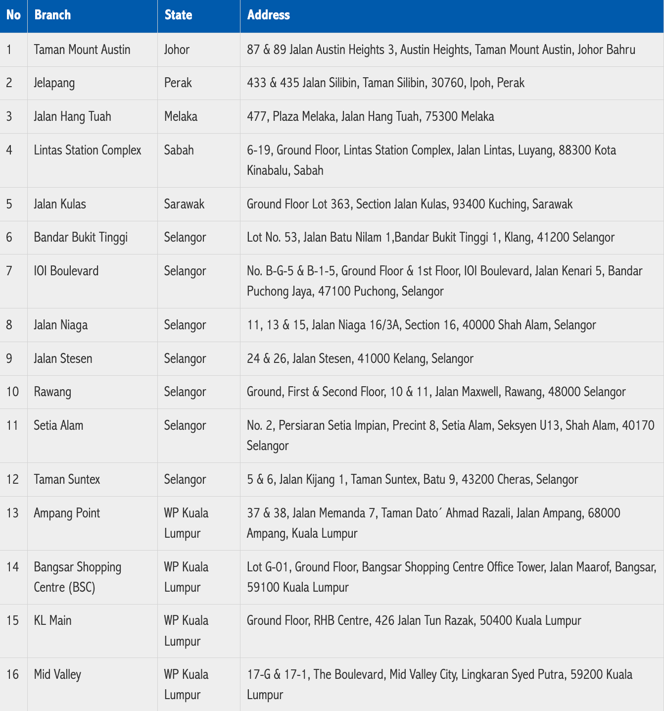 | 11 | Johor Bahru | No. 23, 23-01, 23-02, Jalan Molek 1/29, Taman Molek, 81100 Johor Bahru, Johor |