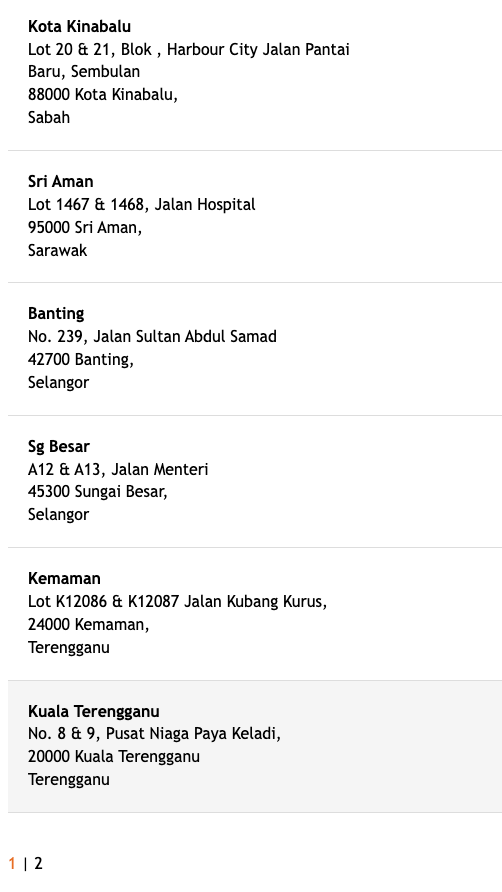 | 9 | Port Dickson | No. 3 & 4, Jalan Mahajaya, P.D. Centre Point, 71000 Port Dickson, Negeri Sembilan |