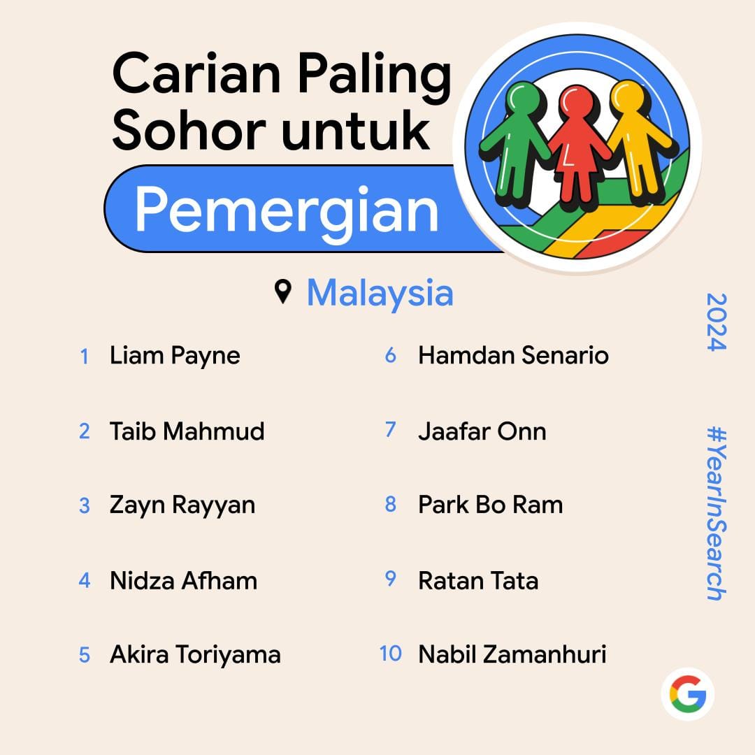 Rakyat Malaysia turut menggunakan Google untuk mengenangi individu yang telah meninggal dunia. Kematian mengejut Liam Payne (#1 Pemergian), bekas ahli One Direction, menggemparkan dunia, manakala pemergian Taib Mahmud (#2 Pemergian), bekas Yang di-Pertua Negeri dan Ketua Menteri Sarawak pula menandakan pengakhiran bab penting dalam politik Malaysia.