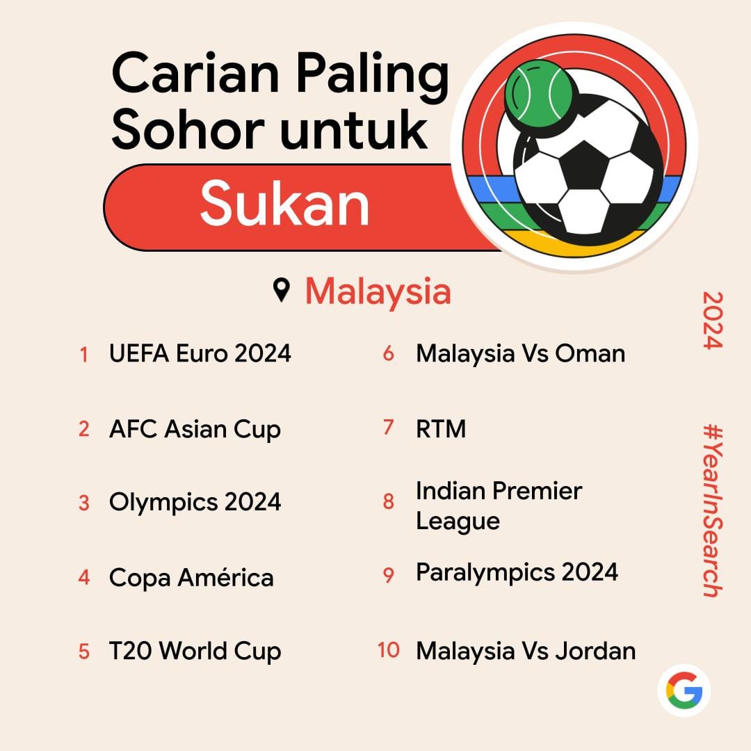 Tahun 2024 menyaksikan rakyat Malaysia terpaku pada skrin, menyokong acara sukan dengan penuh semangat. Enam daripada sepuluh carian trending tahun ini adalah berkaitan sukan. Sama ada menikmati UEFA Euro 2024 (#1 Carian, #1 Sukan) di kedai mamak sambil ditemani teh tarik atau berkumpul bersama keluarga di rumah untuk menyaksikan setiap detik mendebarkan Piala Asia AFC (#4 Carian, #2 Sukan), keterujaan ini jelas bergema di seluruh negara. Copa América (#6 Carian, #4 Sukan) turut menambah kehangatan demam bola sepak, membuktikan bahawa tanpa mengira zon waktu, rakyat Malaysia sentiasa bersedia berjaga malam demi kecintaan terhadap permainan ini.
