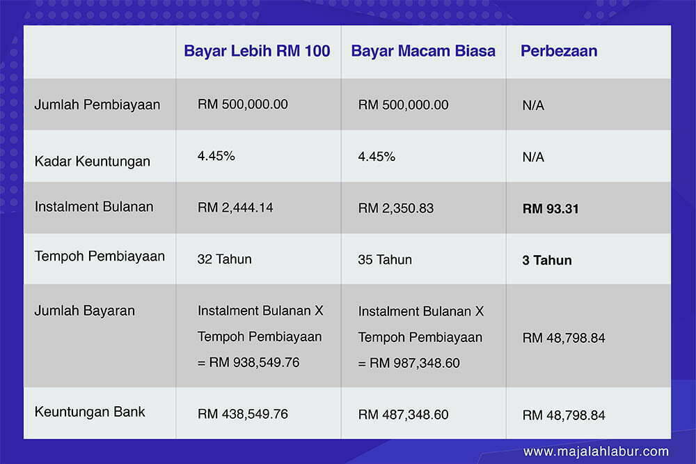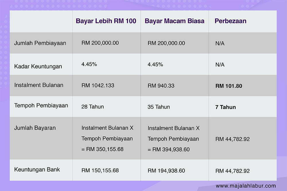 Dah tahu betapa besar perbezaan kalau kita mampu bayar lebih bagi instalment bulanan, maka eloklah kita tahan sikit nafsu untuk berbelanja ke tempat lain. Lagipun rumah merupakan aset yang meningkat nilai saban tahun, maka pengorbanan ini pastinya berbaloi.