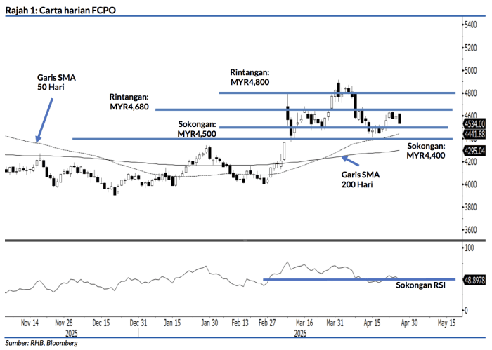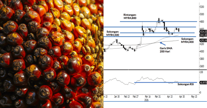 FCPO melanjutkan fasa mendatarnya pada hari Isnin apabila ia menurun MYR63 untuk ditutup pada paras MYR4,534. Ia membuka sesi dagangan pada harga MYR4,620 dan tindakan pengambilan untung mengheretnya ke paras terendah intrahari pada MYR4,531. Komoditi ini kemudiannya ditutup pada harga MYR4,534, dengan menyasarkan paras sokongan MYR4,500 selepas menembusi paras sokongan sebelumnya pada MYR4,550. Meskipun penurunan berlaku, struktur trend kenaikan secara meluasnya masih bertahan, dengan garisan SMA 50 hari masih bergerak ke atas.