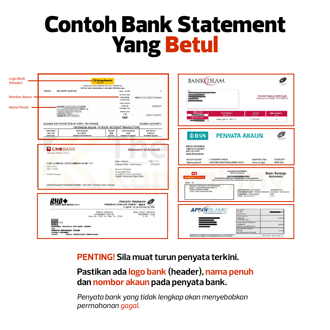 - Penyata bank terkini yang lengkap dengan ‘Header bank’