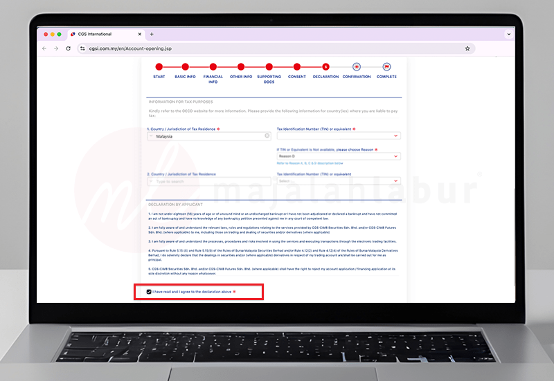 Langkah 5: Baca semua maklumat di bahagian ‘Declaration’. Isi maklumat yang diperlukan dan klik (√ ) pada semua ruang yang berkenaan. Pastikan baca hingga habis.