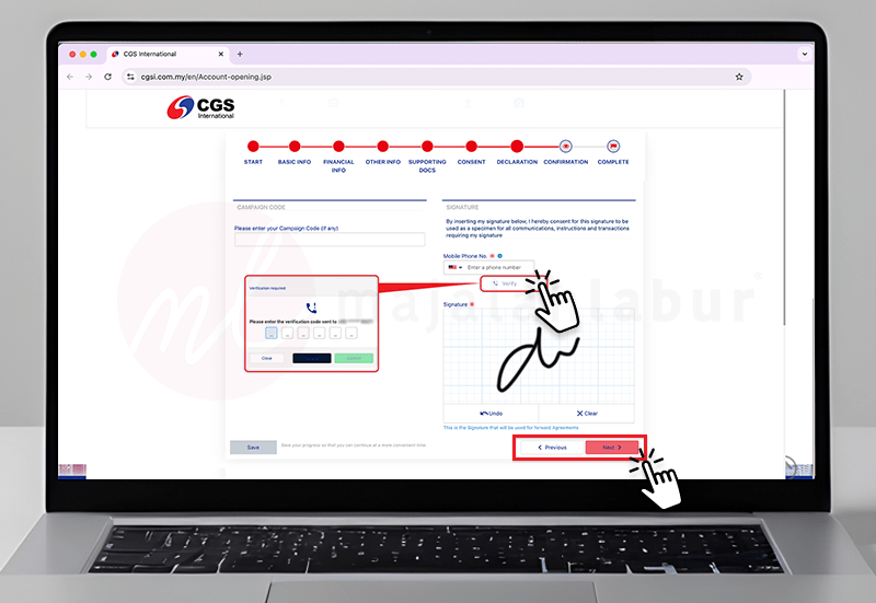 Langkah 6: Masukkan nombor telefon dan klik Verify. Tunggu kod melalui SMS dan masukkan kod yang diterima, selepas itu tanda tangan pada ruang berkenaan. Setelah selesai, klik ‘Next‘.