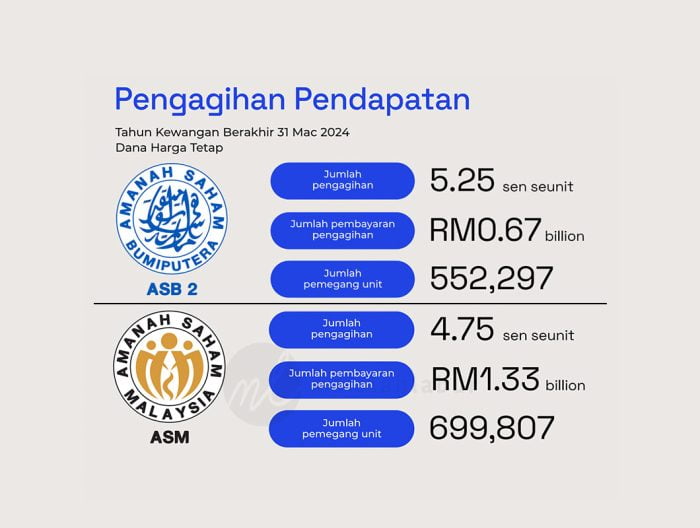 Pengurus dana itu juga mengumumkan pengagihan pendapatan 4.75 sen bernilai RM1.33 bilion untuk Amanah Saham Malaysia (ASM) bagi tahun kewangan berakhir 31 Mac, 2024, yang bakal memanfaatkan 699,807 pemegang unit.