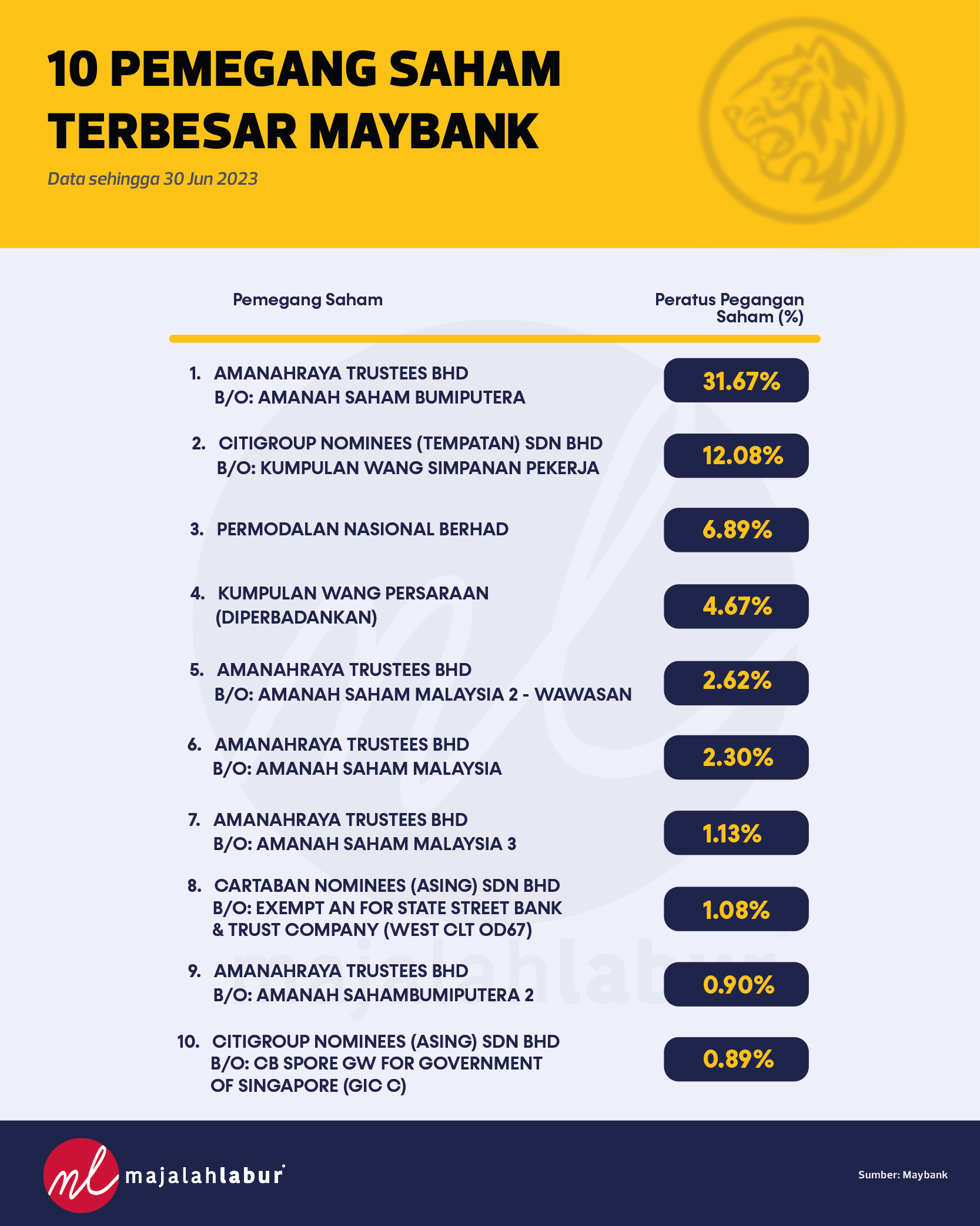 Jom kita tengok 10 pemilik saham terbesar Maybank seperti berikut: