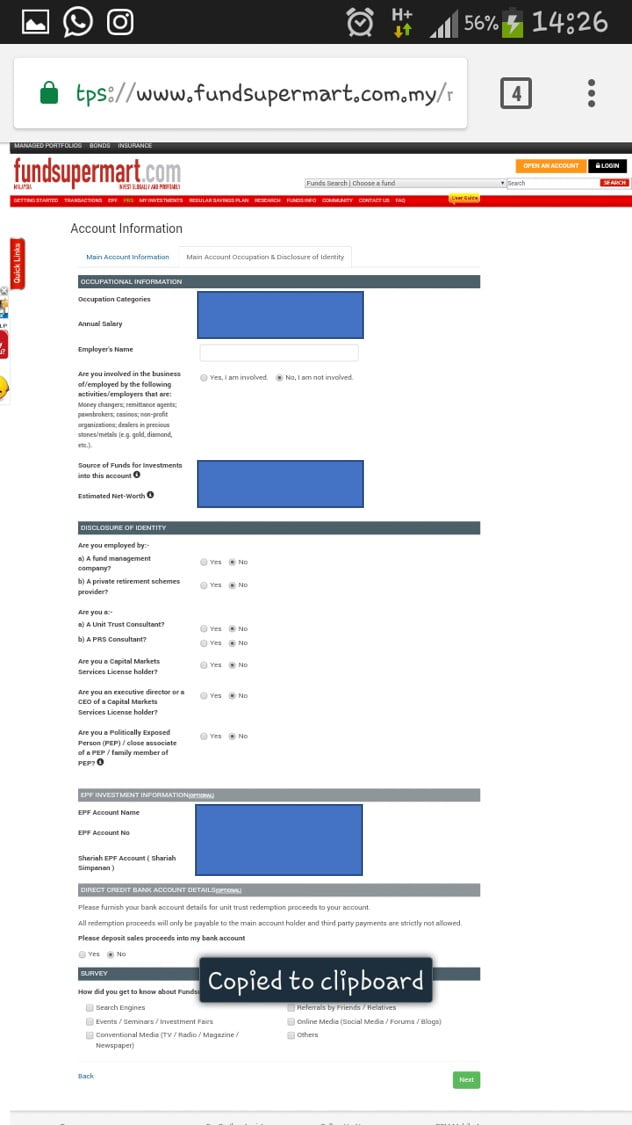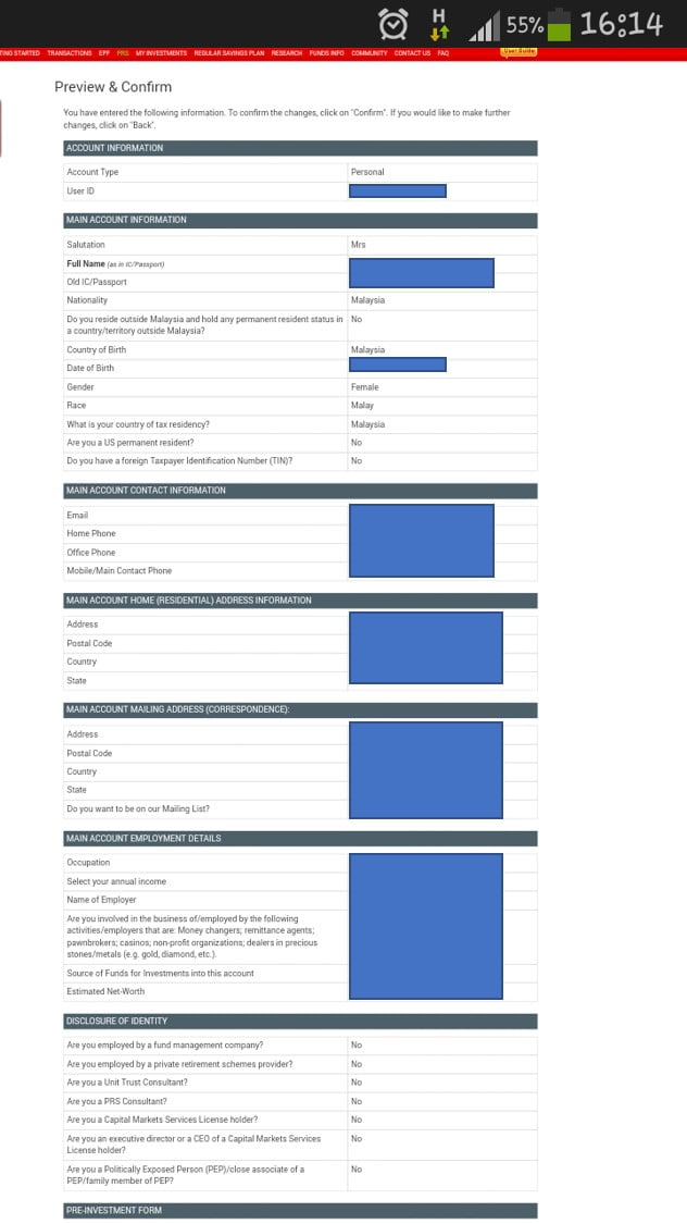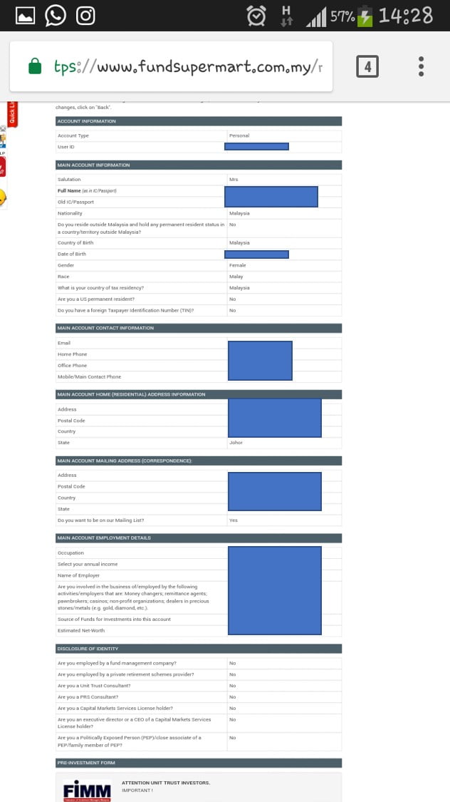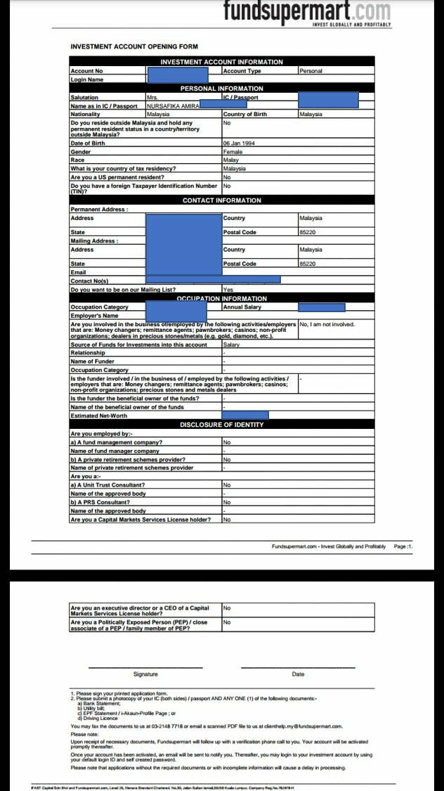 Seterusnya, anda perlu mengisi maklumat akaun yang diperlukan oleh pihak FundSuperMart. Lengkapkan semua maklumat yang diperlukan dengan secara terperinci.