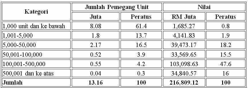 Jumlah simpanan terkumpul 550,000 individu bersamaan dengan RM103.09 bilion. Secara puratanya setiap seorang daripada mereka mempunyai simpanan sebanyak RM187,452.