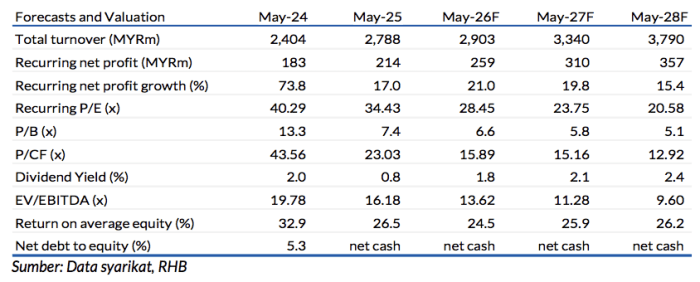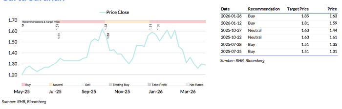 Saranan BELI dikekalkan, dengan harga sasar (TP) baharu mencecah MYR1.80 daripada MYR1.85, potensi kenaikan harga sebanyak 41% dan kadar hasil dividen kira-kira 2% untuk FY27F (Mei)