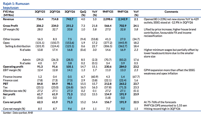 Hasil sepanjang 9MFY26 menokok hanya 2% YoY kepada MYR2.1bn walaupun syarikat menambah 80 buah kedai baharu bersih (+23% pada 429 cawangan) akibat kelemahan SSSG yang berterusan lemah (-12.6%) selepas kenaikan harga pada Apr 2025. Kenaikan harga ini mengembangkan GPM bagi tempoh 9MFY26 sebanyak 5.8ppts kepada 32.8%, yang melebihi kenaikan dalam opex susulan paras gaji minimum yang lebih tinggi. Akibatnya, untung bersih teras bagi 9MFY26 melambung naik 23% kepada MYR192j.