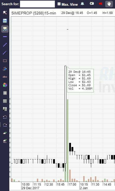 Sepuluh minit terakhir dagangan bagi tahun 2017, saham Sime Darby Property selagi lagi buat kenaikan yang luar biasa dengan jumlah volume lebih banyak iaitu 7.13juta unit untuk tutup pada harga RM1.78. Nampak tak tiba-tiba ada satu line tiba-tiba berada di puncak? Ia telah membuat ‘gap up’, maka inilah yang dinamakan window dressing.