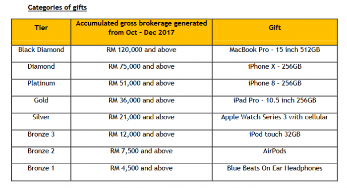 Terdapat 8 hadiah keseluruhan yang ditawarkan berdasarkan jumlah keseluruhan transaski dagangan sepanjang tempoh kempen tersebut. Ini adalah senarai hadiah yang ditawarkan: