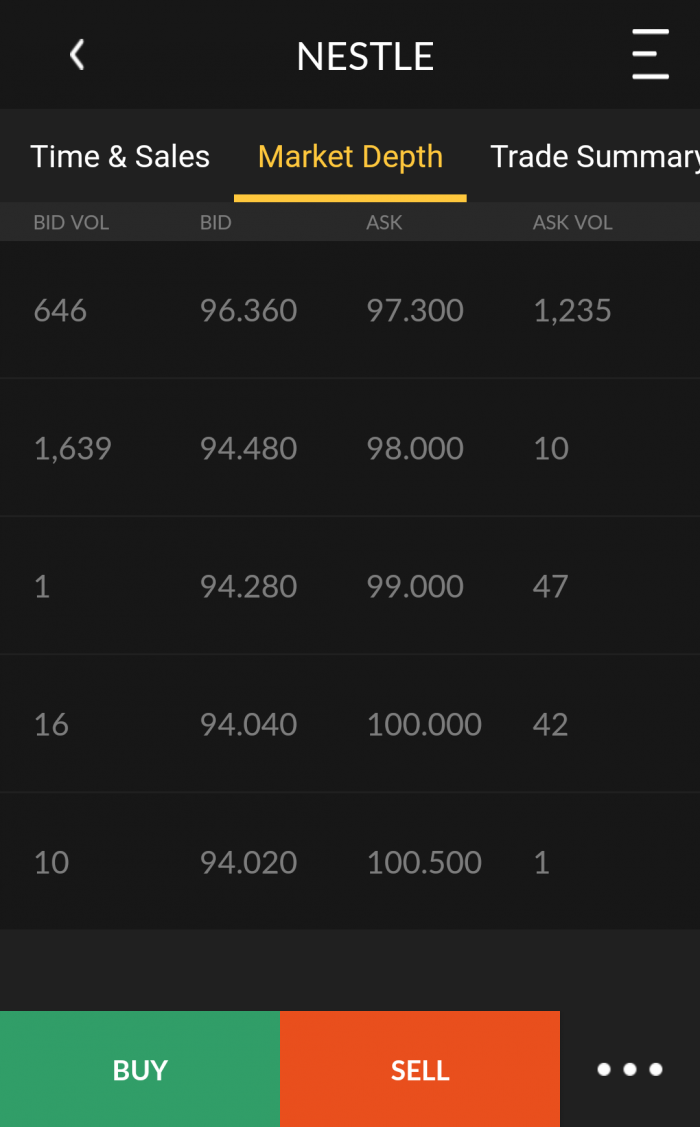 6. Paparan market depth- Anda dapat melihat 5 harga pembeli tertinggi dan 5 harga seller terendah