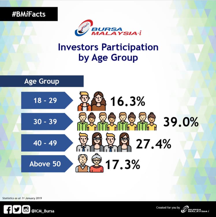 Kajian juga menunjukkan bahawa golongan yang berumur 18-39 tahun, adalah empat kali lebih cenderung untuk melabur saham berbanding pelabur yang lebih tua. Biasalah, mereka yang lebih muda ini sanggup mengambil risiko yang lebih tinggi, maka pulangan pun lebih tinggi berbanding instrumen pelaburan lain. Bak kata pepatah, “High Risk High Return”.