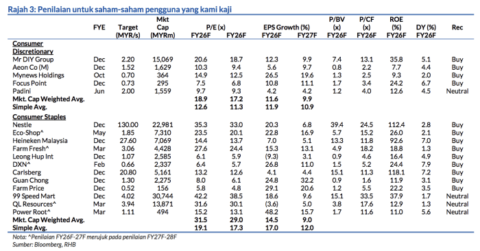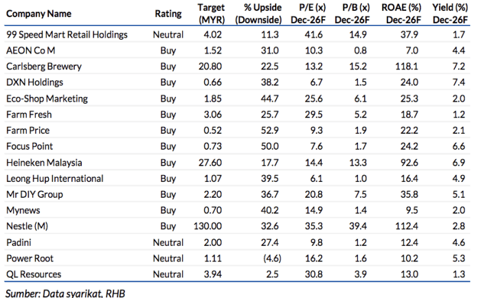Kami menyukai saham Nestle disebabkan oleh tawaran barangan asas dan potensi pemulihan margin berikutan kos input dan FX yang menguntungkan; FFB – atas sebab permintaan untuk barangannya, disokong oleh nilai jenama, beberapa faktor pertumbuhan (keupayaan pengeluaran ais krim yang diperluaskan, pengembangan ke pasaran luar negara) bagi mengekalkan pertumbuhan perolehan; MRDIY – kerana penimbal margin yang kukuh ekoran FX dan skala operasi yang semakin besar, bayaran dividen tinggi (kadar hasil kira-kira 5%), ECOSHOP – penimbal margin, menghampiri asas SSSG baru dan potensi cerah buat industri kedai barangan berharga murah.