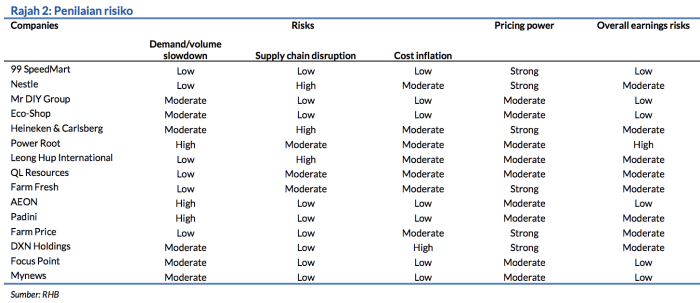 Dengan mempertimbangkan risiko tekanan inflasi dan sentimen pengguna yang lebih lemah, kami sarankan pelaburan dalam syarikat-syarikat dengan komposisi produk yang berkisarkan barangan keperluan, dengan risiko yang rendah terhadap perolehan akibat kenaikan kos atau gangguan rantaian bekalan dan juga syarikat-syarikat yang mempunyai penimbal margin atau kuasa penetapan harga yang kukuh.