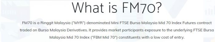 FM70 adalah kontrak niaga hadapan berdenominasi ringgit yang menjejaki Indeks FTSE Bursa Malaysia Mid 70 (FBM Mid 70) sebagai instrumen pendasarnya, memberikan pendedahan kepada semua 70 syarikat FBM Mid 70 melalui kontrak niaga hadapan tunggal.