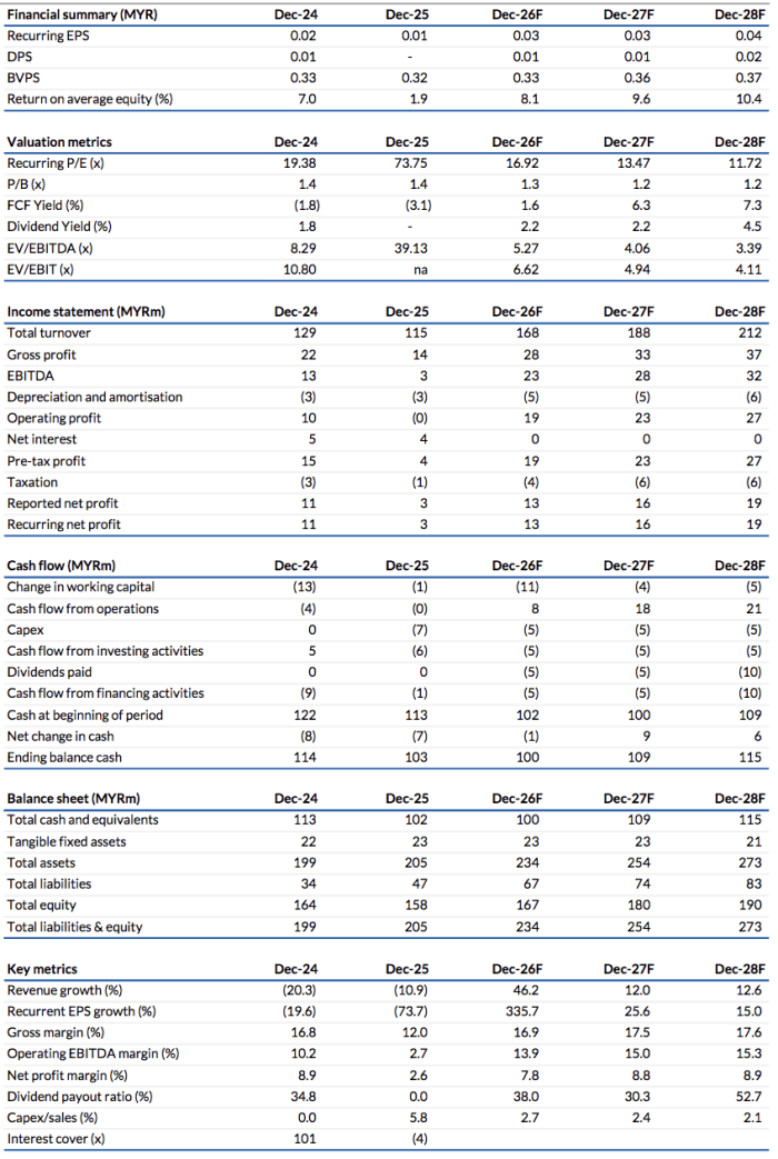 Kami kekalkan ramalan perolehan FY26 kerana andaianandaian teras tetap sama, dengan FY26 dijangka mencatat asas perolehan baru yang disokong oleh momentum tempahan, penormalan margin, dan sumbangan daripada ODM/OEM. TP kami sebanyak MYR0.55, berdasarkan P/E FY26F 21x (+1SD berbanding purata lima tahun), turut mengambil kira diskaun ESG 2%. Risiko utama: Kegagalan untuk mendapatkan projek baru.