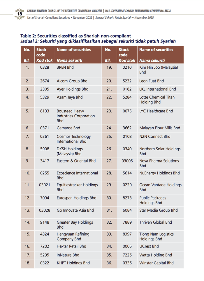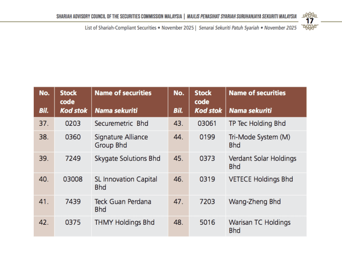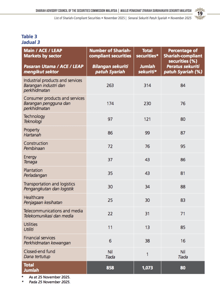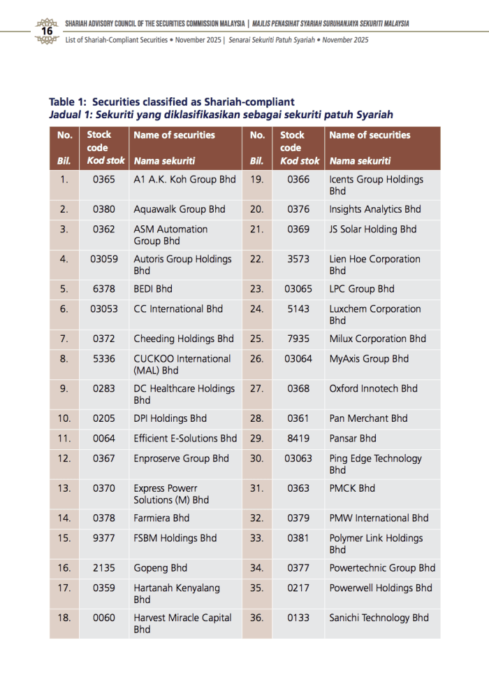 Suruhanjaya Sekuriti Malaysia (SC) baru saja mengeluarkan senarai kemas kini sekuriti patuh Syariah yang berkuatkuasa 28 November 2025. Aktiviti ini pada kebiasaannya akan dijalankan pada bulan Mei dan November setiap tahun.