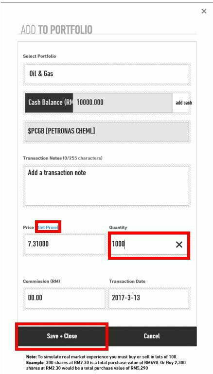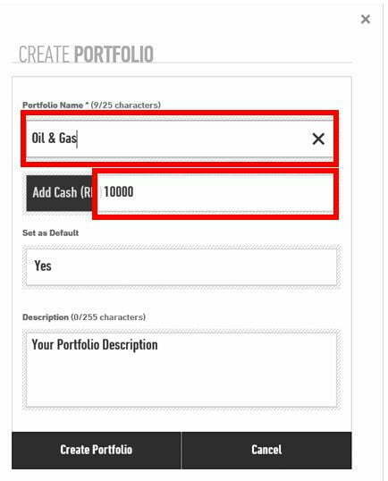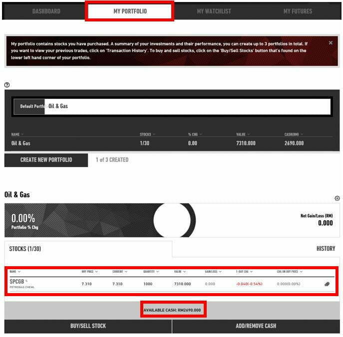9. Anda perlu Create Portfolio terlebih dahulu untuk masukkan modal anda. Klik pada Tab MY PORTFOLIO dan Masukkan Nama Portfolio – Oil & Gas, dan nilai Add Cash RM10,000 dan klik Create Portfolio. Tiada betul salah di sini, masukkan ikut suka.
