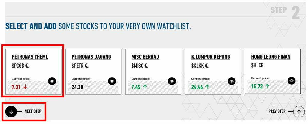4. Pilih saham mana yang anda mahu perhatikan. Pilih PETRONAS CHEML -> Next Step