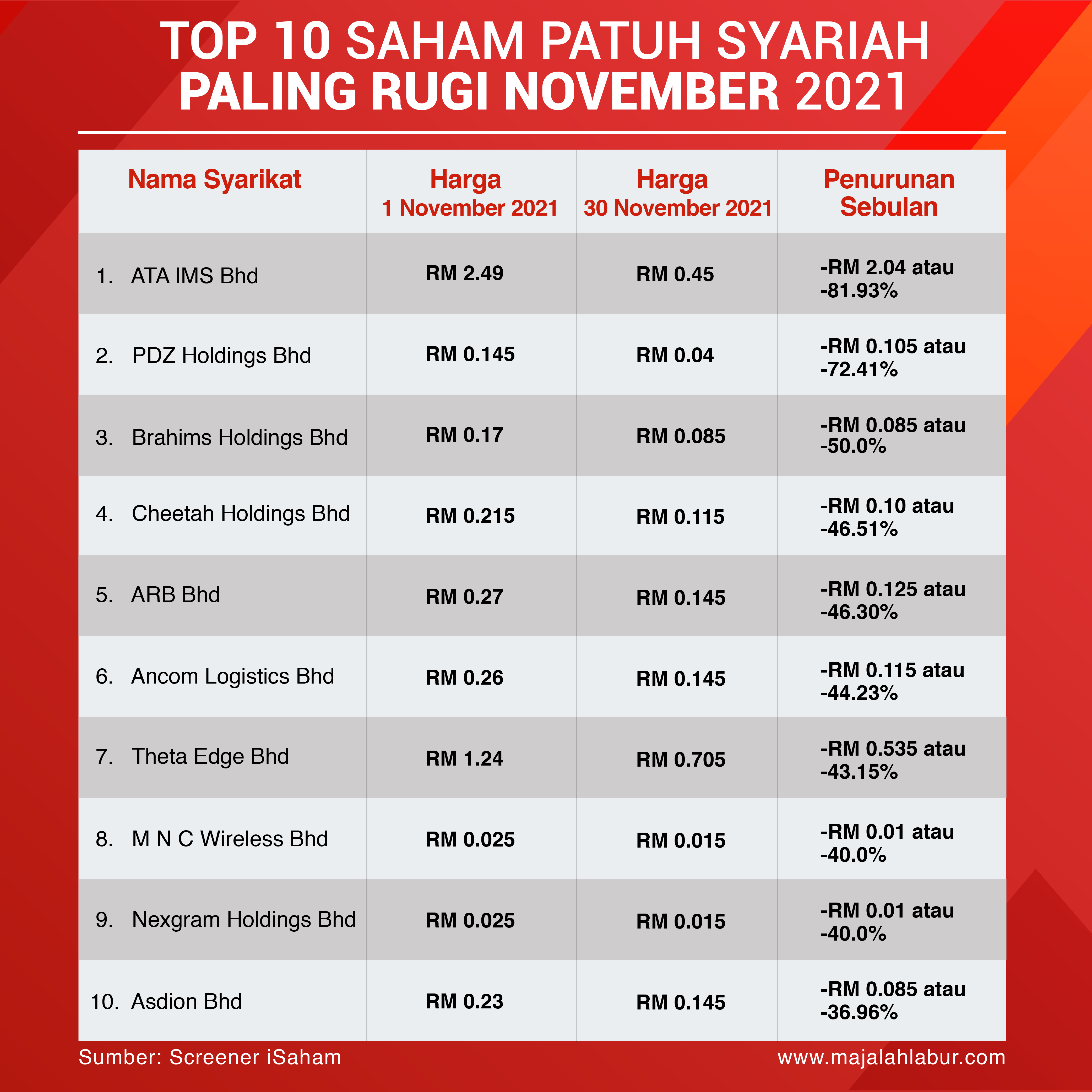 Bila pasaran saham merah, maka banyak jugalah saham-saham yang jatuh. Jom kita tengok senarai Top 10 Saham Patuh Syariah Paling Rugi Bulan November 2021 ini dan berdoa agar dijauhkan daripada kerugian yang besar.