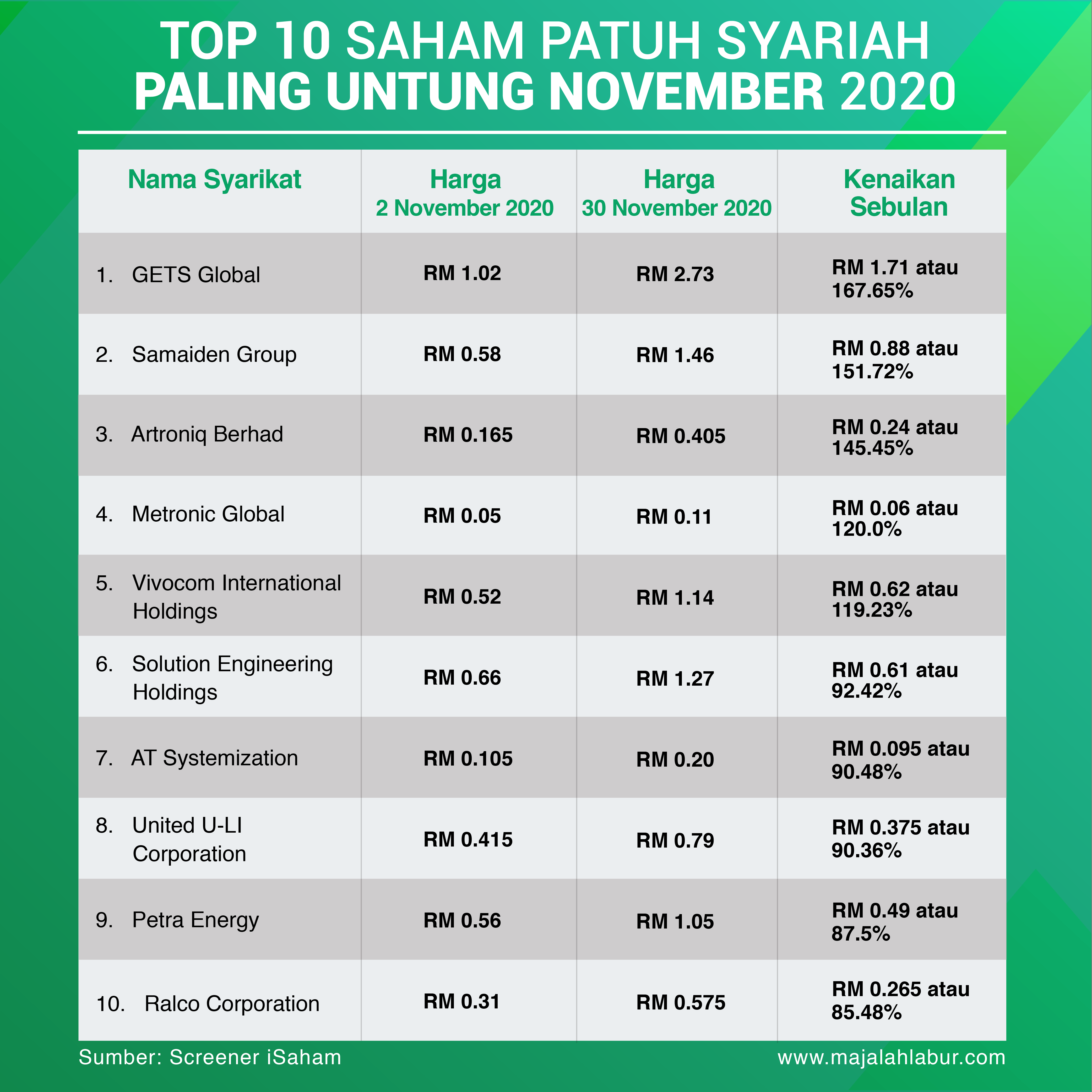 Dengan kenaikan tinggi yang dicatatkan pasaran saham Malaysia, mesti ramai yang tersenyum gembira dengan mencatatkan keuntungan yang baik. Jom kita tengok senarai Top 10 Saham Patuh Syariah Paling Untung November 2020: