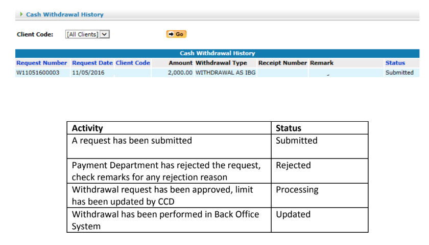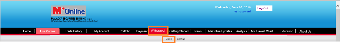 Sebagai contoh, kami sediakan langkah demi langkah jika anda merupakan pelanggan M+ (Malacca Securities). Pengeluaran duit dari akaun trading boleh dilakukan di laman web M+ (Tempoh pemprosesan setiap hari Isnin hingga Jumaat sebelum jam 4 petang)