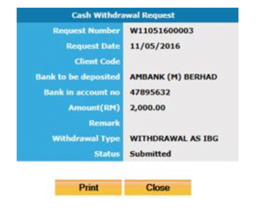 Pelanggan boleh memilih jenis pengeluaran sama ada melalui cek atau Inter Bank Giro (IBG) transfer ke akaun bank.