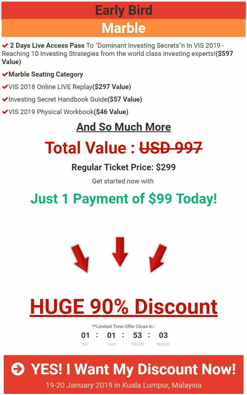 Kalau nak tahu, ‘orang lain’ sanggup bayar sehingga $99 US Dolar (RM410) untuk hadiri seminar pelaburan saham (asas pula tu). Nak seat harga $199 (RM824) juga ada.
