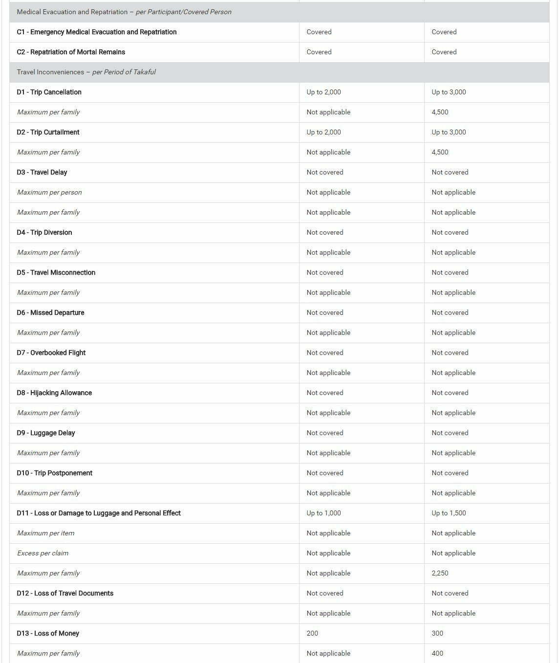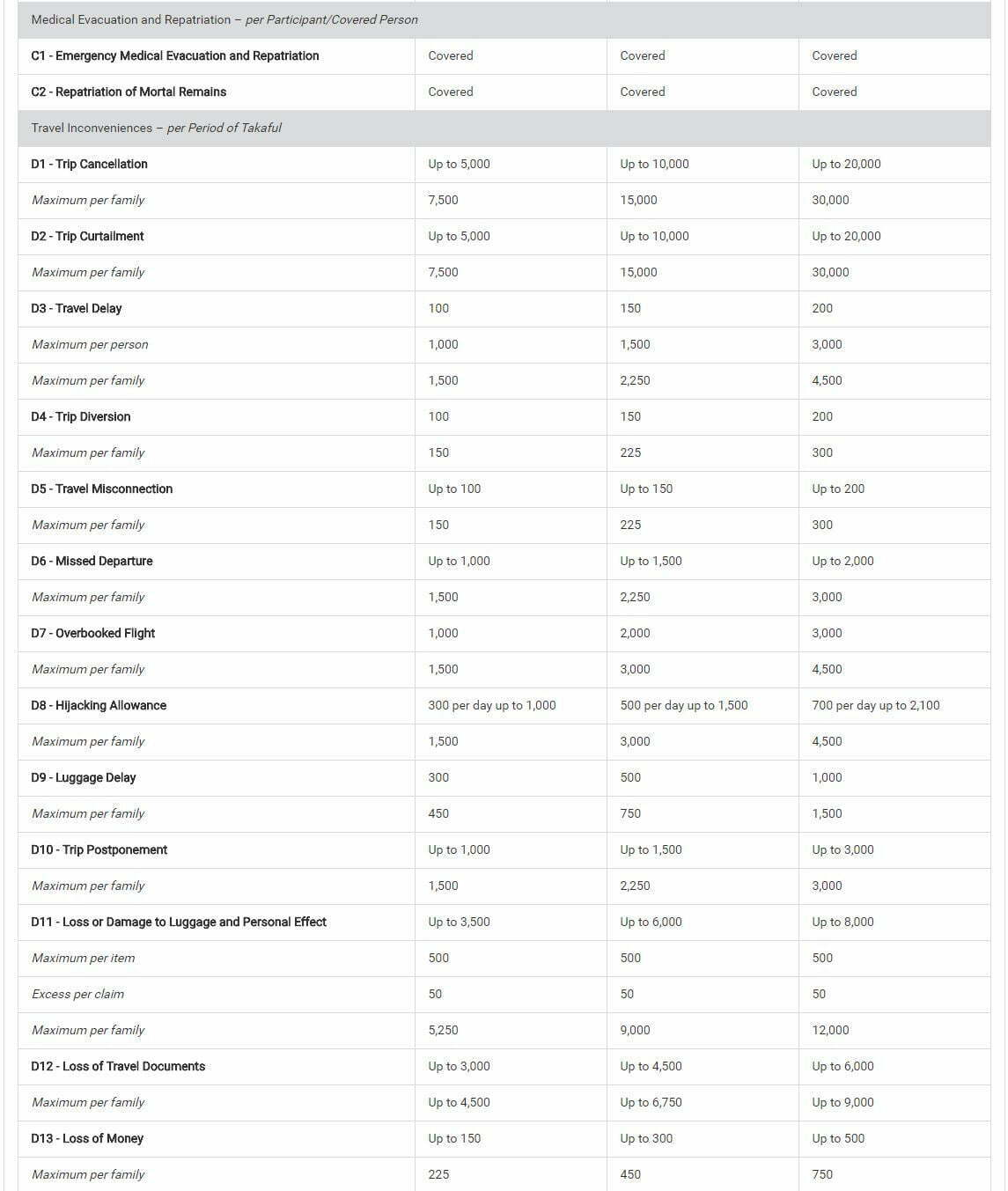 Secara asasnya, kebanyakan produk Travel Takaful memberi perlindungan seperti: