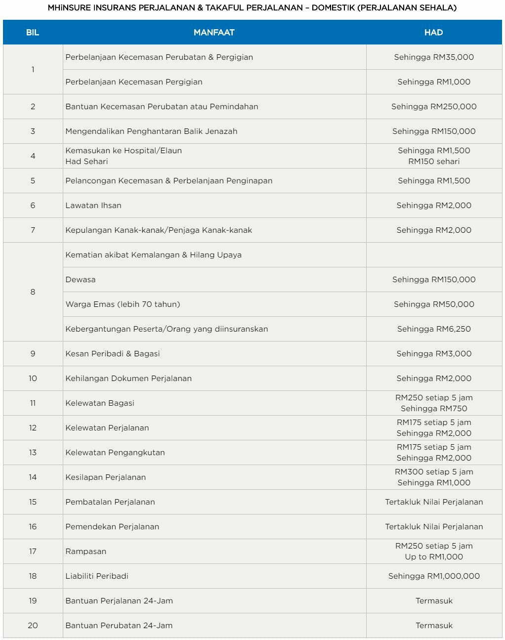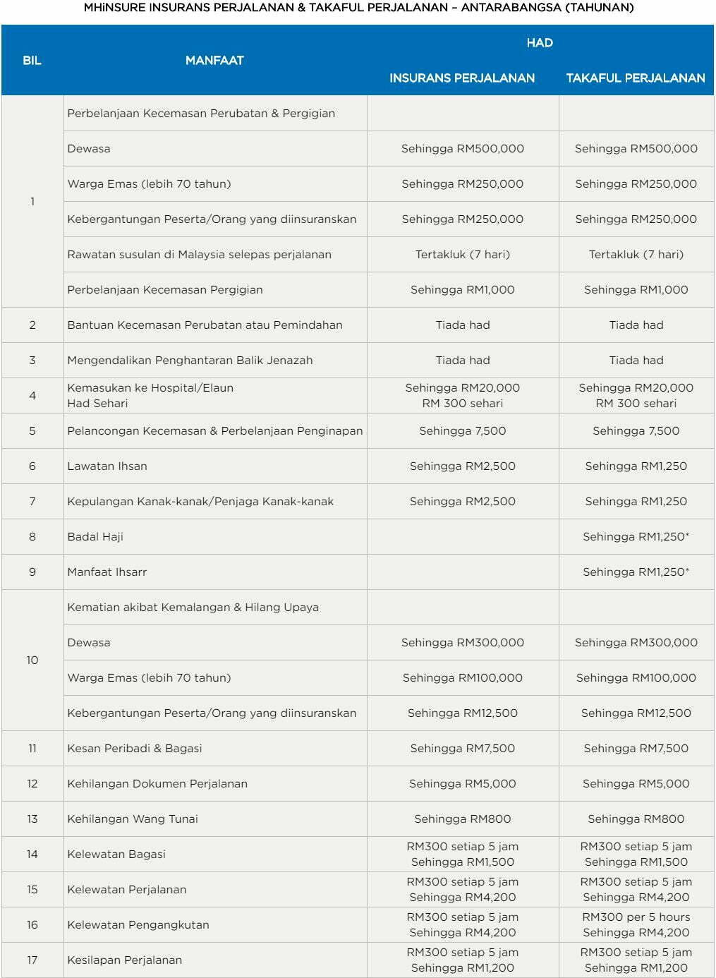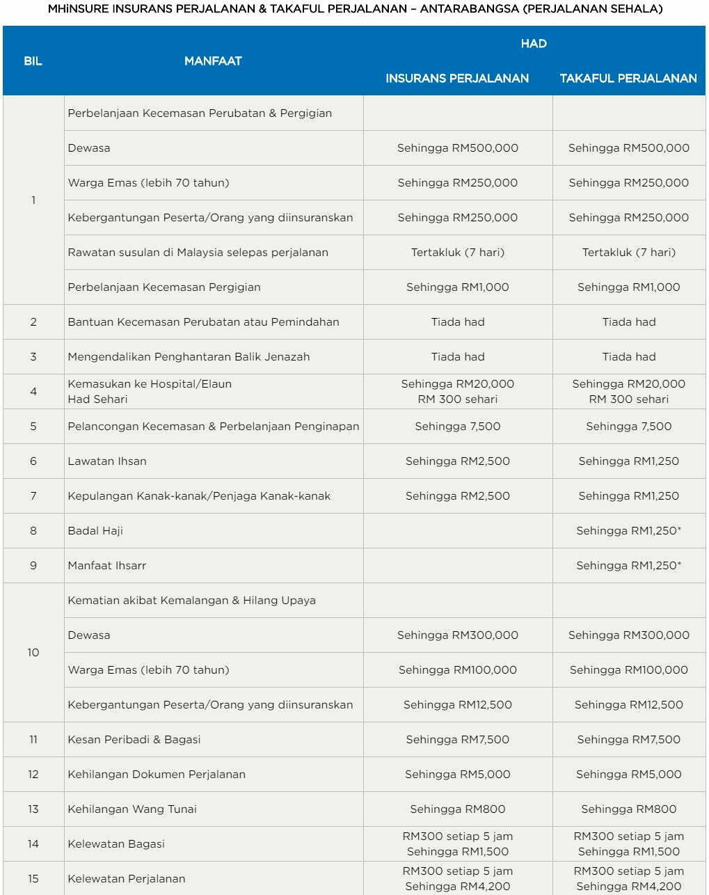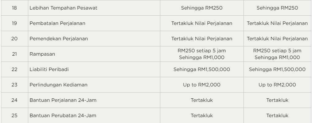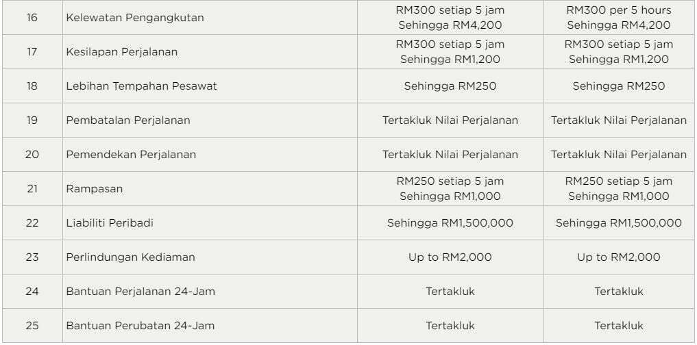 Di antara manfaat yang bakal diperolehi pula adalah Talian Bantuan Perubatan dan Perjalanan 24-jam, Perlindungan Komprehensif untuk pasangan dan anak-anak, Perlindungan Perubatan seperti kemasukan ke hospital dan perbelanjaan rawatan, Kesulitan Perjalanan seperti pembatalan perjalanan dan kelewatan perjalanan, Kehilangan Atau Kelewatan Bagasi, Kehilangan Dokumen Perjalanan, Kematian Tidak Sengaja atau Ketidakupayaan Kekal dan Perlindungan Keganasan.